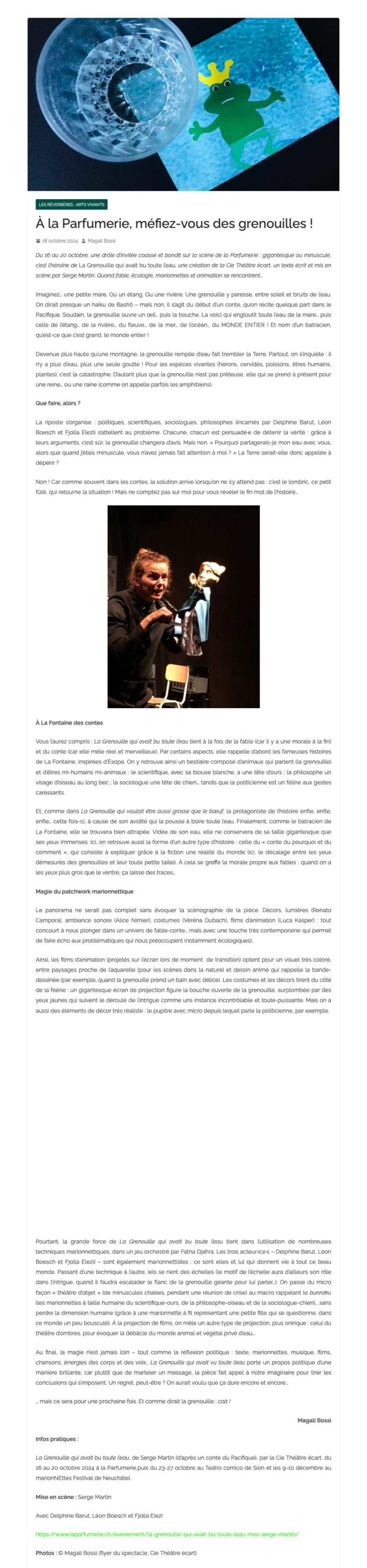 Une grenouille qui vole toute l’eau de la Terre, c’est la convoitise pour s’enrichir, un désir fou de tout posséder. Ce vol de la vie déclenche une catastrophe écologique entrainant une crise sanitaire. Que font les autorités ? Heureusement, un ver de terre va nous sauver. Des marionnettes géantes ou minuscules, trois petits films d’animation et le plaisir du jeu : toute la magie de la fable !